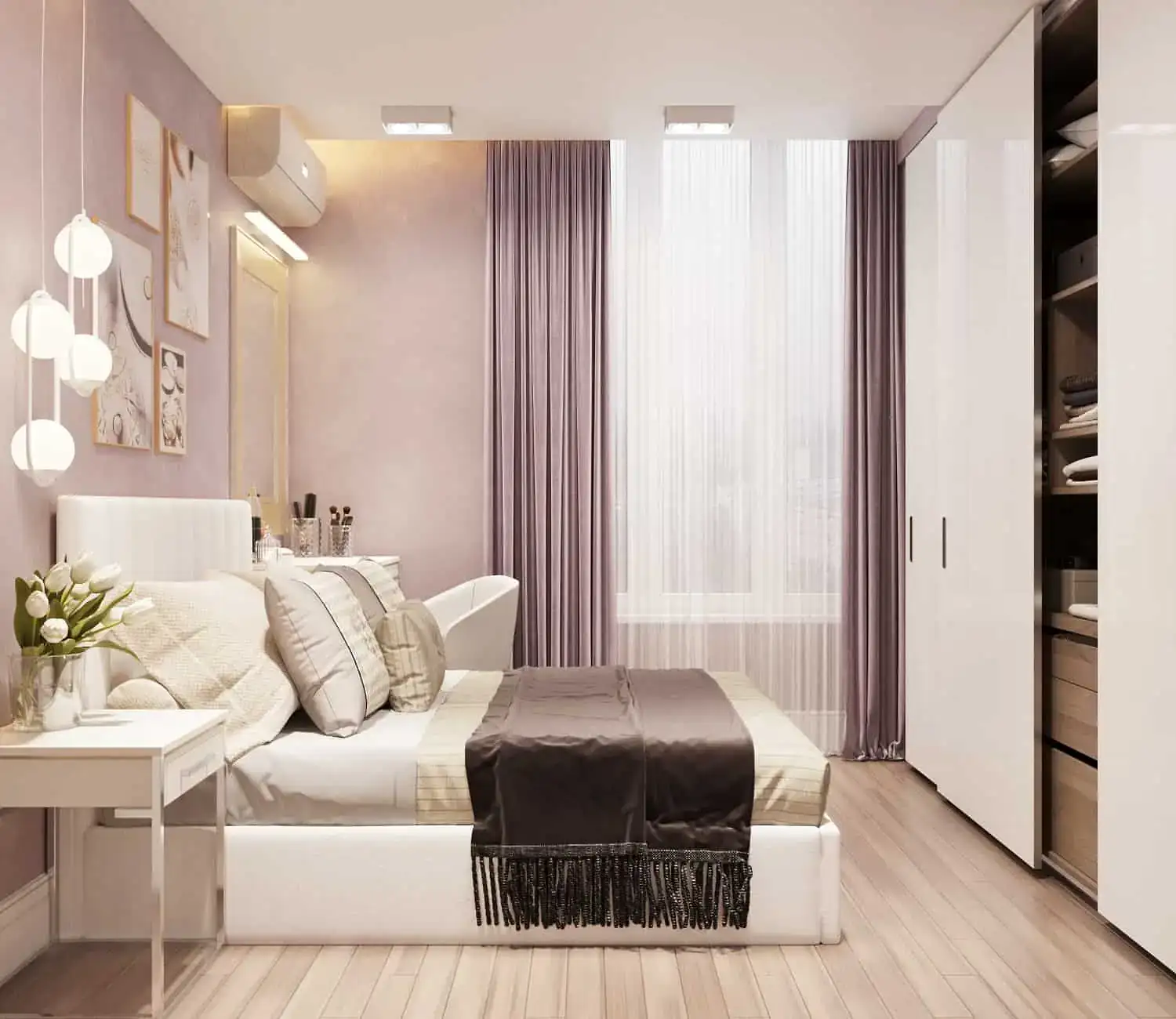 В спальне на Pin-Up был сделан короб, в котором скрывался ригель и оригинальная подсветка.
