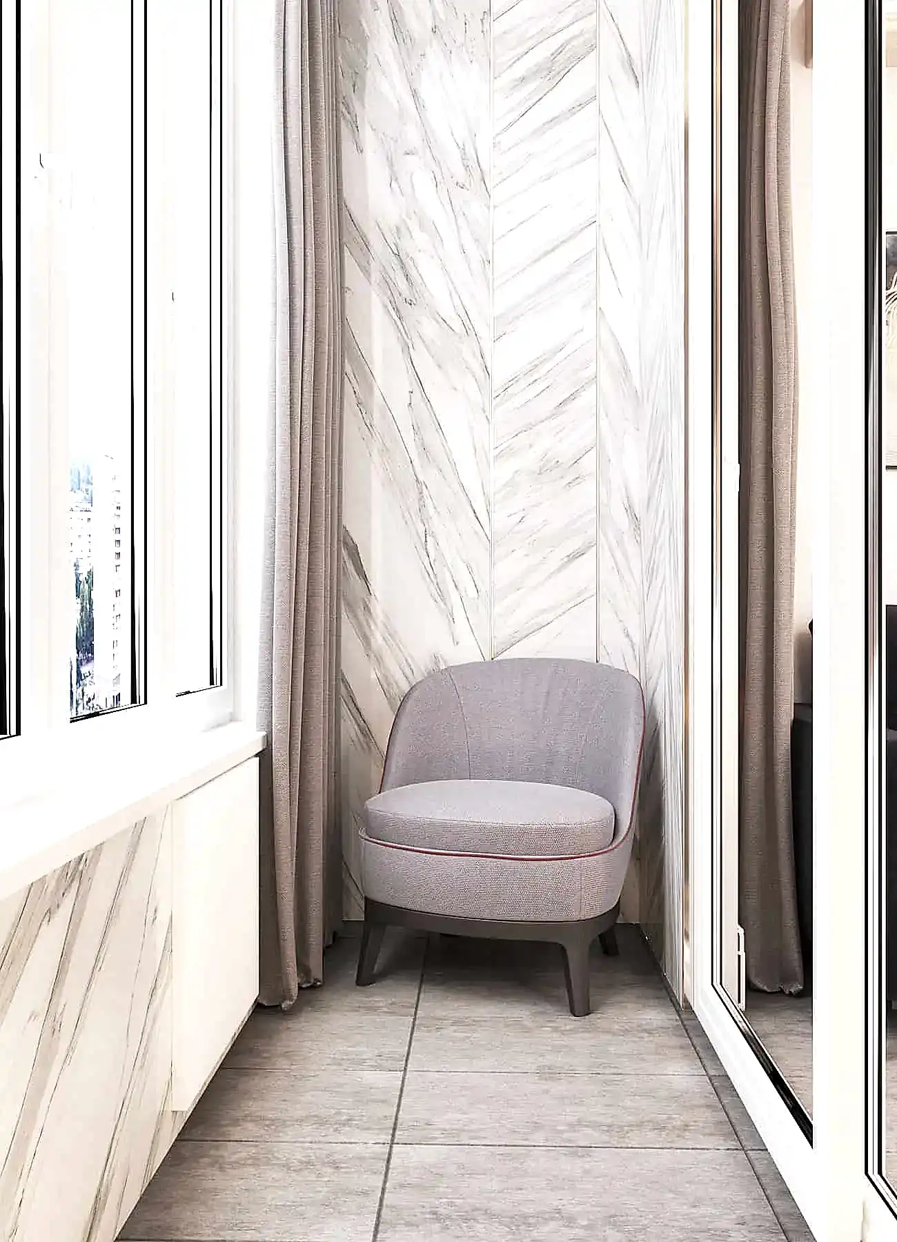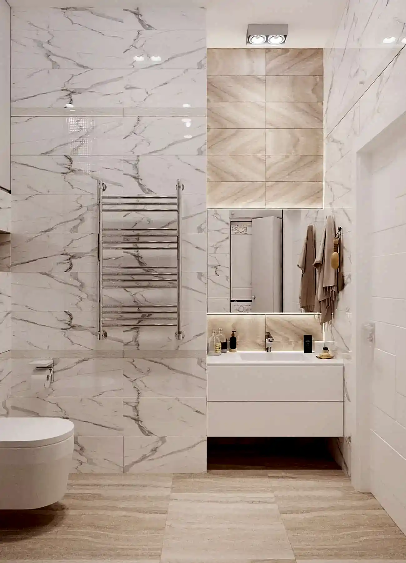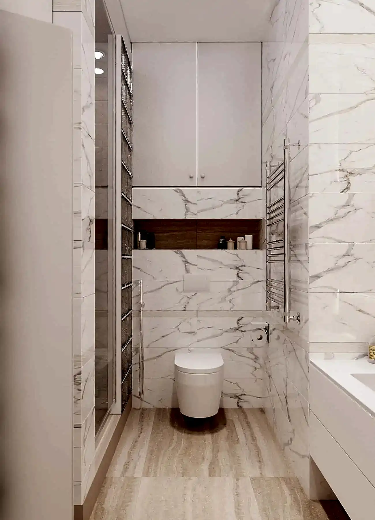 В коридоре был установлен вместительный шкаф, где будет храниться пылесос. В ванной комнате мы учли размещение стиральной и сушильной машины, а также стеклянные Pin-Up которые становятся очень актуальными☘️. Белый под мрамор керамогранит создал дополнительный уют в данном помещении.
